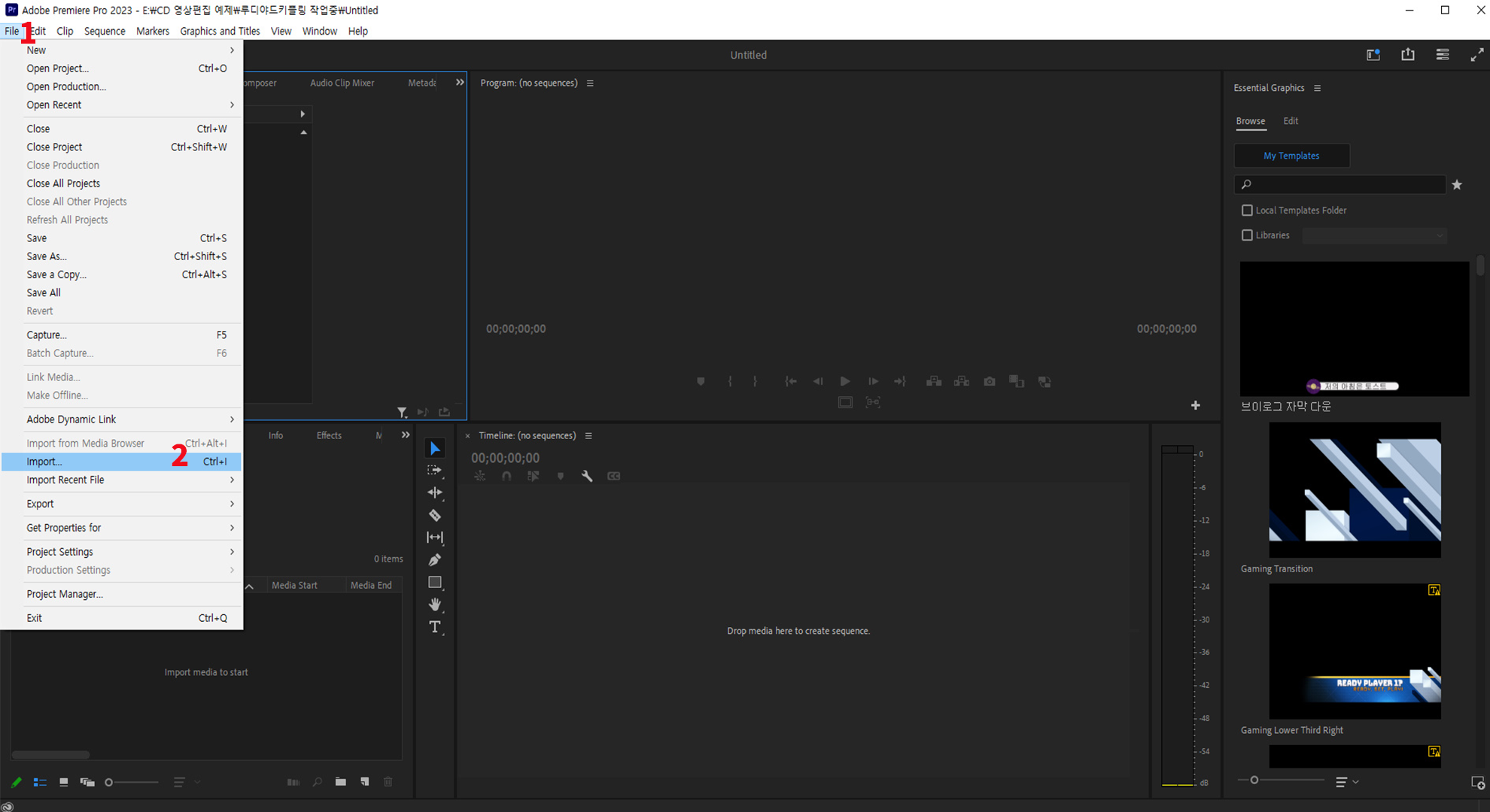 왼쪽 상단의 File → Import를 클릭하거나 단축키 Ctrl+I로 편집할 영상을 불러옵니다. 사용할 파일을 2개 이상 준비하세요. 해상도와 프레임레이트가 다른 파일은 결과가 달라질 수 있으니 가능하면 동일한 설정의 클립을 사용하면 좋습니다.