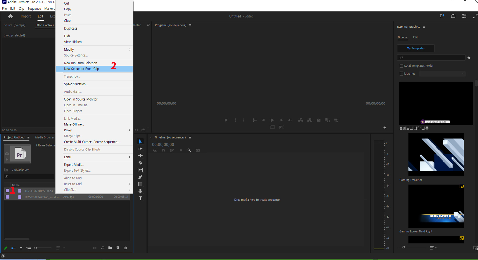 불러온 클립을 우클릭한 뒤 'New Sequence From Clip'을 선택하면 자동으로 시퀀스가 생성됩니다. 또는 파일을 드래그해 타임라인에 직접 놓아도 됩니다. 타임라인의 트랙 위치를 확인해 영상이 겹치지 않도록 정리하세요.