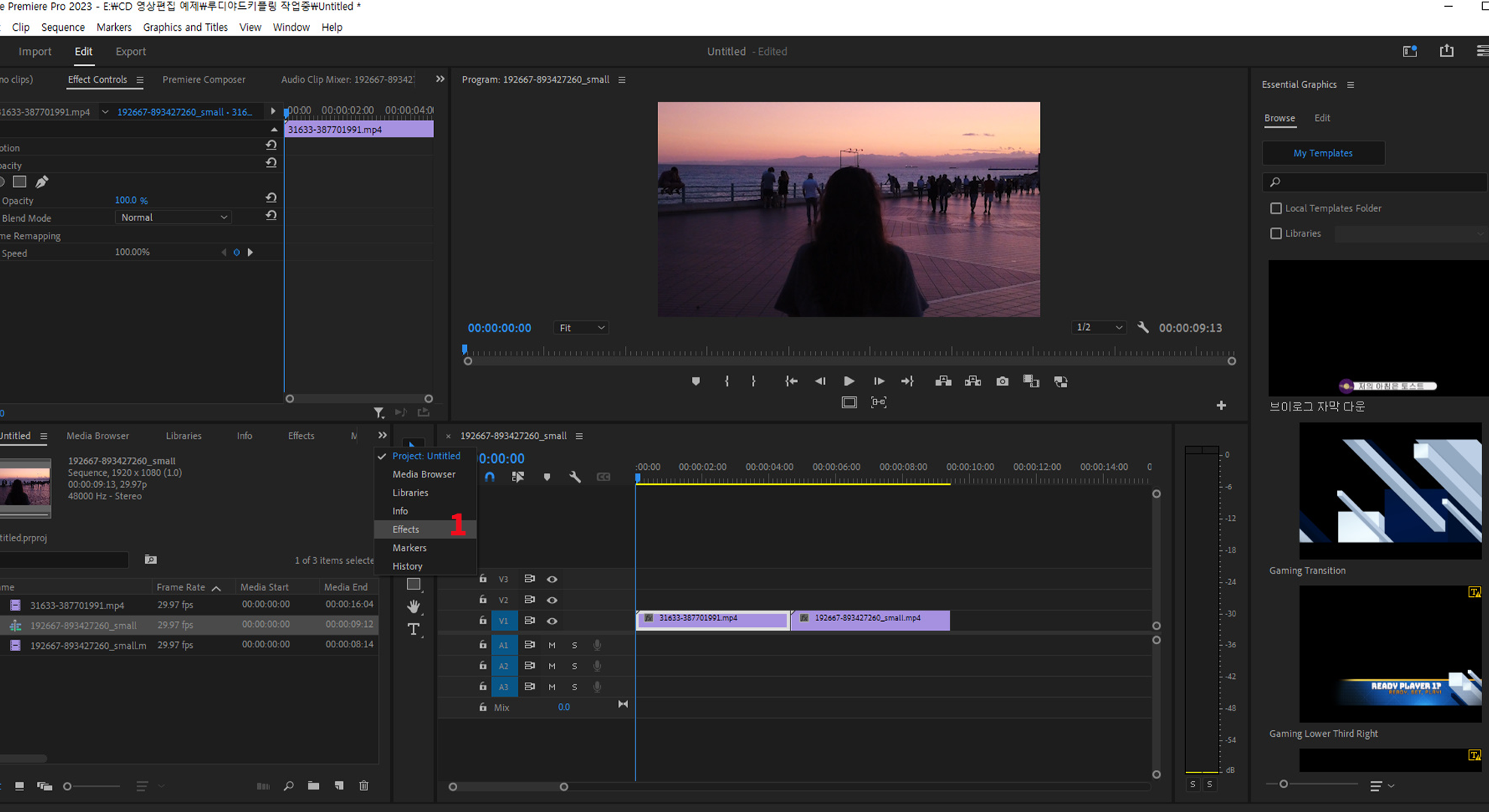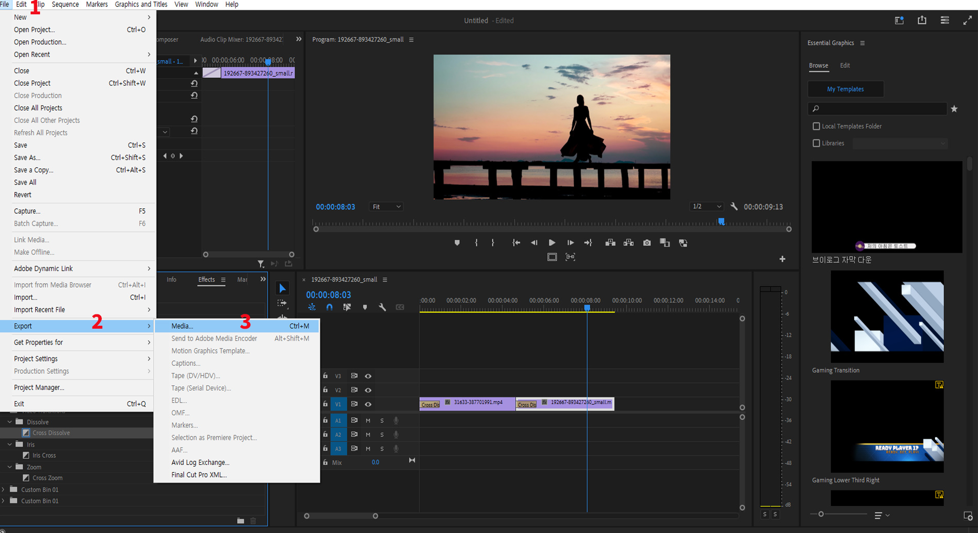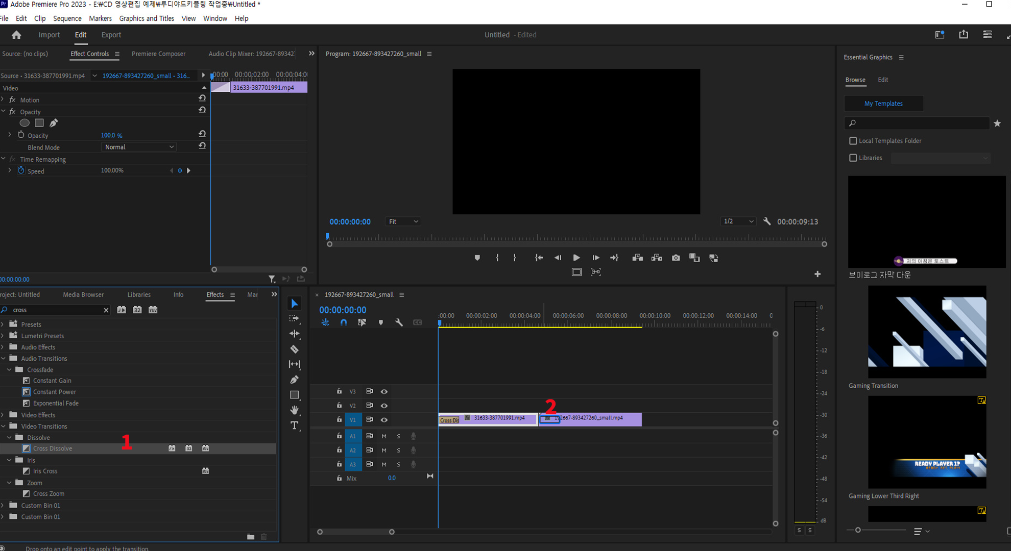 Effects 패널을 열고 검색창에 'Cross Dissolve' 또는 '크로스 디졸브'를 입력합니다. 검색된 효과를 마우스로 클릭해 드래그한 뒤 두 클립이 만나는 경계에 드롭하면 자동으로 전환 효과가 적용됩니다. 전환 길이는 효과의 양 끝을 드래그해 늘리거나 줄일 수 있습니다.